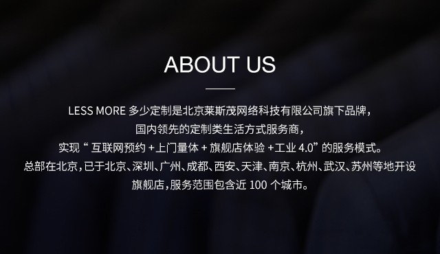 LESS MORE多少定制 2015年5月創(chuàng)立于北京,以互聯網思維和工業4.0切入服裝定制領域,獨創(chuàng)“互聯網預約+旗艦店體驗+免費上門量體+工業4.0 C2M生產”的模式,現已成為國內服裝定制行業的標桿品牌。